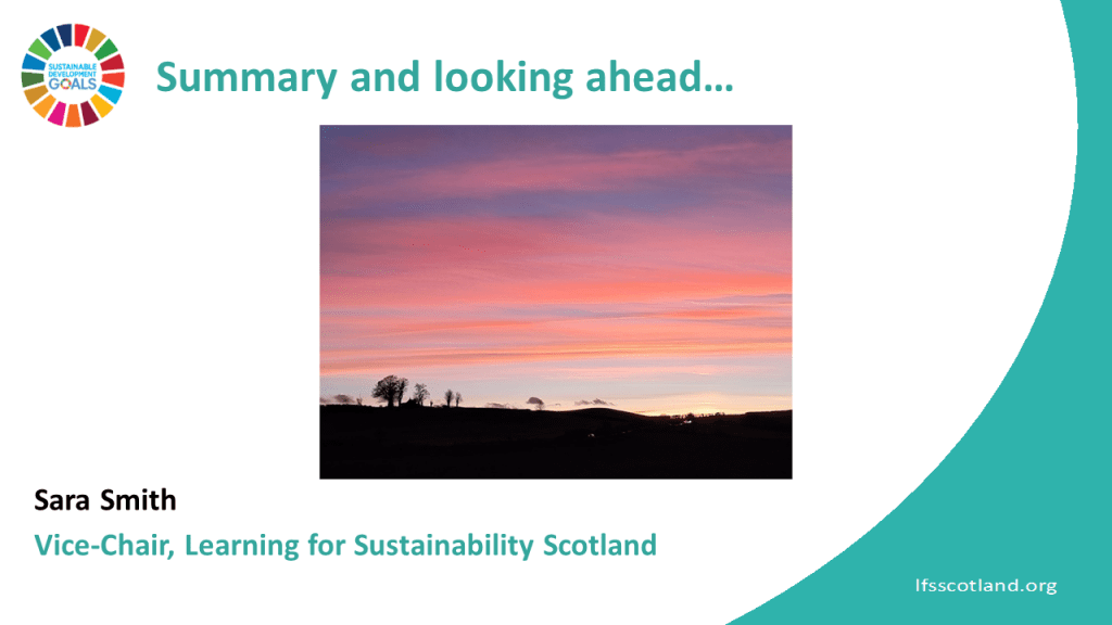 Particular thanks goes to all of our contributors and speakers; whose expertise provided our audience with such a wonderful range of insights and skills; but also to our members; whose ongoing support, passion, and creativity continues to contribute so much to advancing Learning for Sustainability across Scotland and beyond.