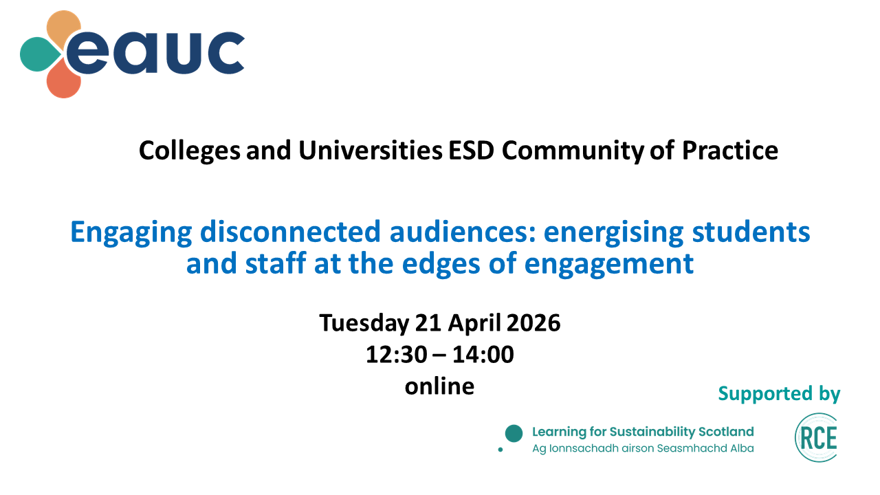 Join us and EAUC for our next Education for Sustainable Development Community of Practice (ESD CoP) meeting of 2026. This will be chaired by co-convenor Lou Mycroft, Green Changemakers Project... [read more]