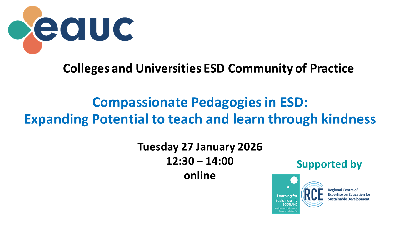 Join us and EAUC for our first Education for Sustainable Development Community of Practice (ESD CoP) meeting of 2026. This will have a focus on: We'll address compassion towards self,... [read more]
